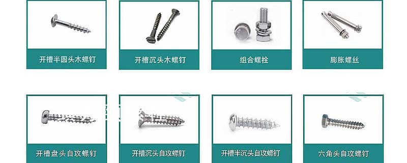 螺栓有:1、方頭螺栓,2、半圓頭方頸螺栓,3、十字槽盤頭螺釘,4、內六角沉頭螺釘,5、方螺母C級,6、蝶形螺母,7、六角頭螺栓,8、十字槽盤頭自攻螺釘。大小有M18、M6、M8、M16、M10、M12、M14、M20等型號。通常用 沉頭方頸螺栓、馬車螺栓、圓頭帶榫螺栓、圓頭螺栓、扭剪型螺栓、方頭螺栓、活結螺栓、十二角螺栓、地角螺栓、膨脹螺栓、太陽能用雙段牙螺栓、內六角圓柱頭螺絲、內六角沉頭螺絲、半圓頭內六角螺絲、內六角圓柱頭軸肩螺絲、